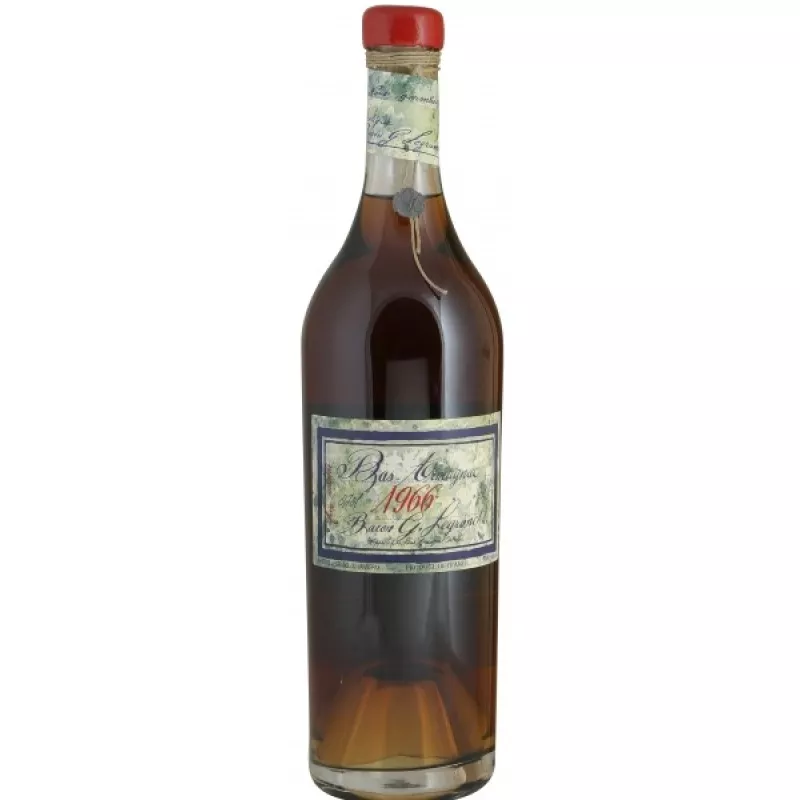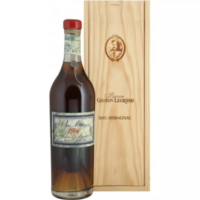 Арманіяк Bas Armagnac Baron Gaston Legrand 1966 (Барон Гастон Легран 1966) - арманьяк з чудовим ароматом фруктів і ванілі, що перетікає в мінеральні ноти, з багатим, сильним смаком, але зовсім неагресивними спиртами, з яскраво вираженими нотами меду. Є чудовим дижестивом, тобто. сприяє травленню та вживається в кінці трапези, проте якщо він вживається в середині обіду, то до нього підходять копчений лосось, вишукані ковбасні вироби, страви гасконського кухні, фуа-гра, соуси, традиційні фламбе з м'яса та дичини. Арманіяк подається до десерту (арманьяк з яблуком, з шоколадом), при цьому міцність напою пом'якшується солодкою стравою. З ним варто скуштувати ягоди та фрукти — аженський чорнослив, черешню, малину, апельсин. Також арманьяк відмінно поєднується з кавою та сигарами. Температура подачі, З: 20-22 Виноградник: Виноград зібраний у субрегіоні Bas Armagnac. Ґрунти піщані. Спосіб виробництва: Арманьяк готується за технологією коньяку шляхом дистиляції білого виноградного вина в перегінному апараті з подальшою витримкою в дубових бочках. Дистиляцію виноматеріалів здійснюють на шарантських апаратах, що застосовуються в коньячному виробництві та спеціальних арманьячних аламбиках безперервної дії. Спосіб витримки: Наприкінці процесу витримки арманьяк іноді переливають у величезні бочки ємністю 10 тисяч літрів, де його старіння сповільнюється. Бочки з арманьяком зберігаються на земляній підлозі в льохах, збудованих із місцевого каменю. Тому після такого терміну витримки його переливають у скляні чани чи бутлі, де процес старіння припиняється, і арманьяк зберігає свій чудовий аромат.