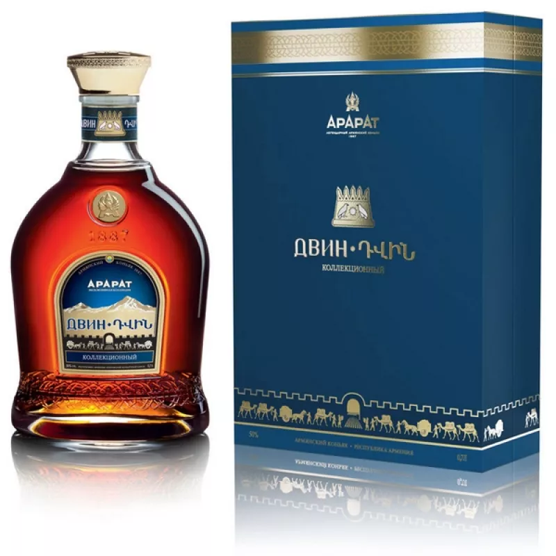 Маркар Седракян, технолог-віртуоз Єреванського Коньячного Заводу, у 1945 році створив перший твір Ексклюзивної колекції Арарат - дивовижний коньяк "Двін" 10-річної витримки. Шедевр коньячного мистецтва отримав безліч призів на міжнародних конкурсах, серед них — 10 золотих медалей. Чудовий у своїй благородній могутності, істинно чоловічий напій, п'ятдесятиградусний "Двін" призначений для справжніх поціновувачів та знавців унікальних коньяків із багаторічною історією та традиціями. У 2011 році Арарат виробляє ребрендинг улюбленого дітища та відновлює випуск коньяку "Двін" у новій упаковці, присвяченій легендарній столиці Середньовічної Вірменії, на честь якої коньяк знайшов своє ім'я. Яскравим символом нового образу, що запам'ятовується, стала розташована в центрі корона династії царів, Аршакідов, на часи правління якої припав розквіт древнього міста. Ланцюжок каравану, навантажений важкою поклажею заморських скарбів, що бреде нижнім краєм коробки, нагадує про вікову славу і розкіш «міста достатку», найважливішого торгового центру на Великому шовковому шляху та одному з найбільших і розвинених міст орієнтального світу.